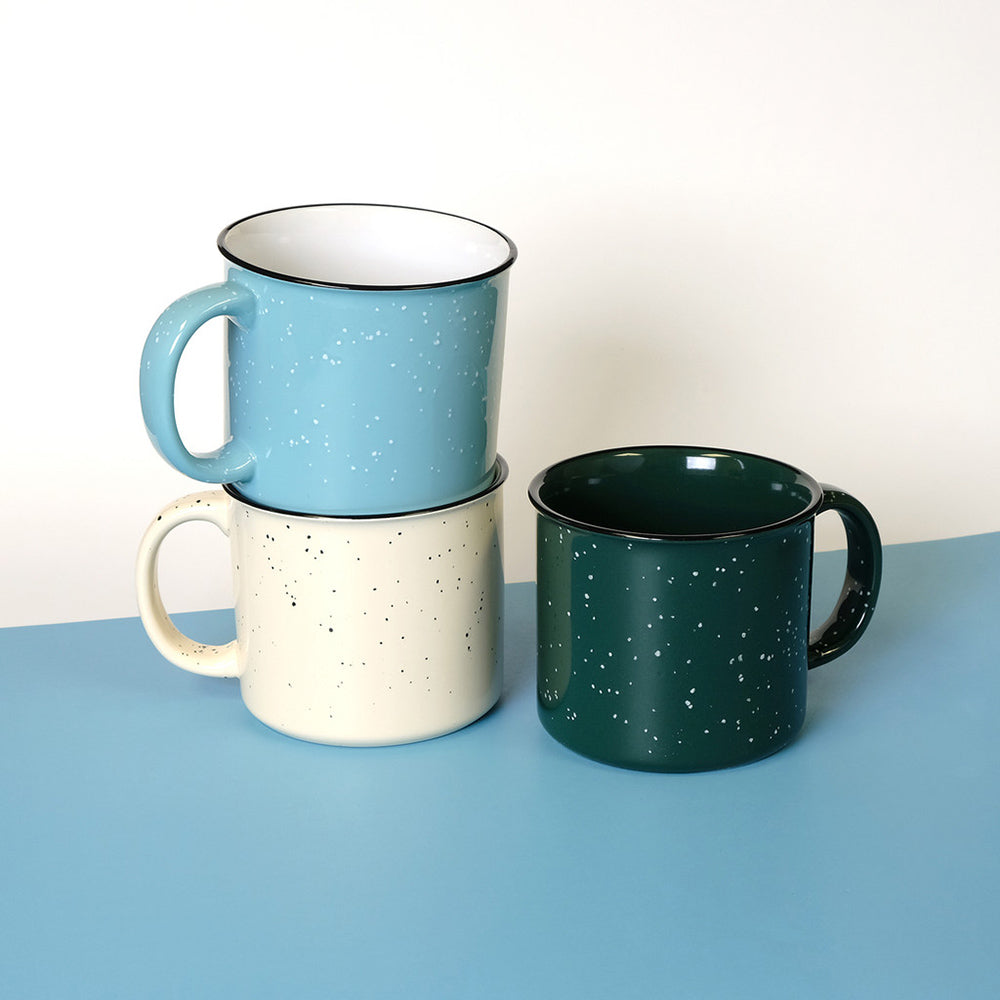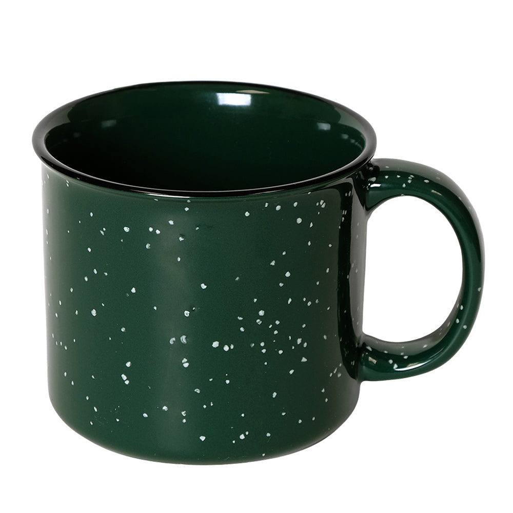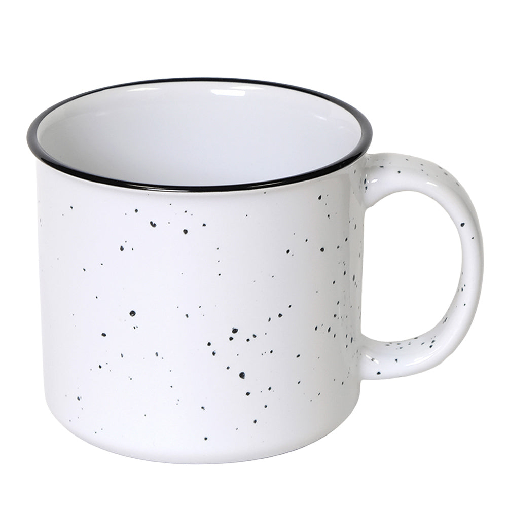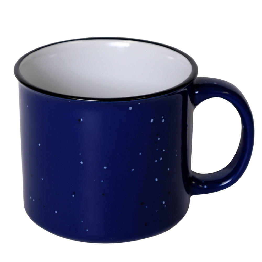 Tasse de camp en céramique de 15 oz avec fini moucheté lustré; rebord noir; large ouverture et grande poignée robuste; couleur intérieure variable selon la couleur extérieure; va au micro‑ondes; lavage à la main recommandé; non recommandé pour un usage commercial.
