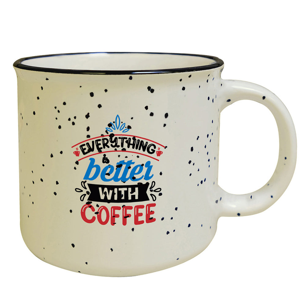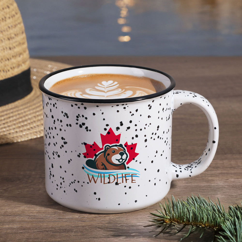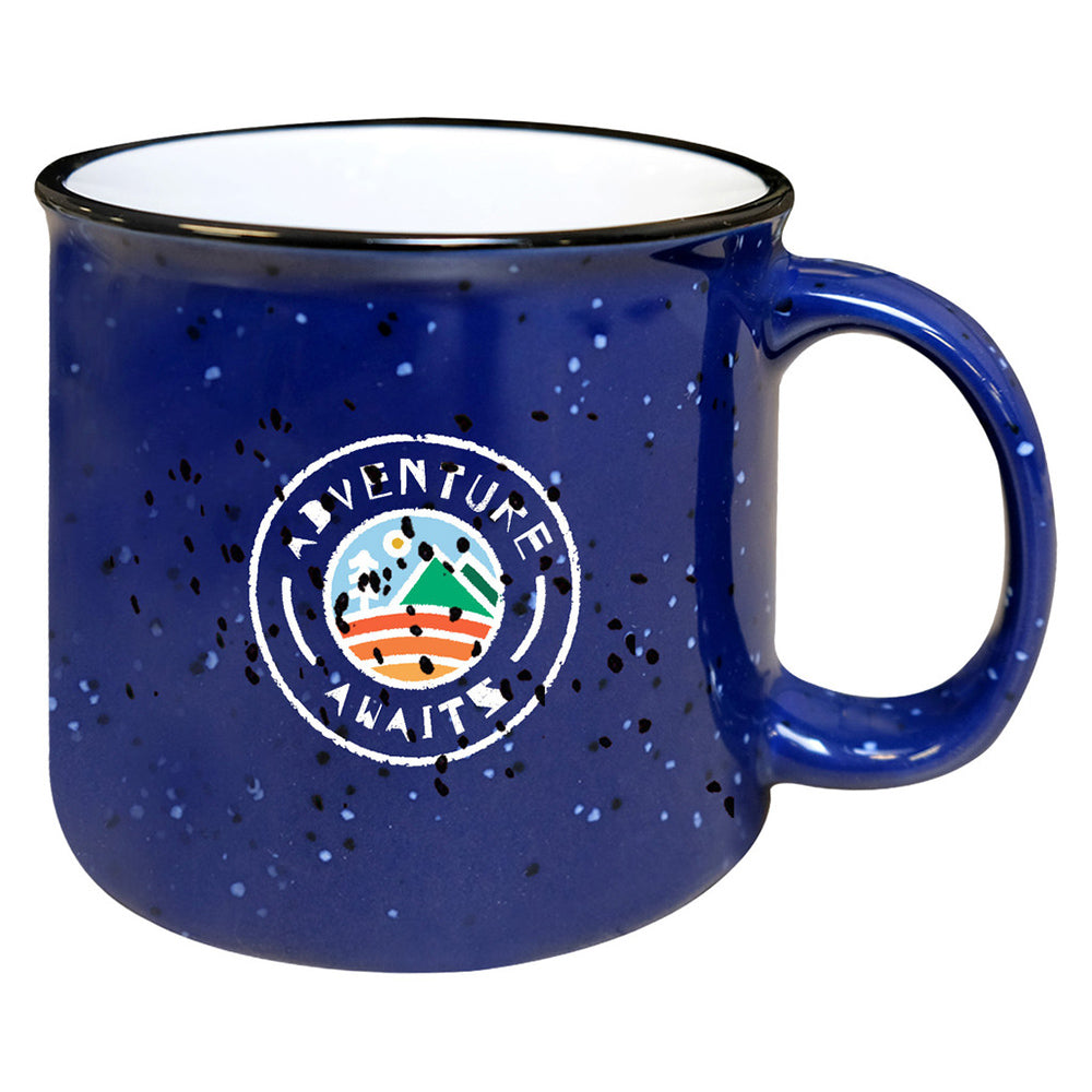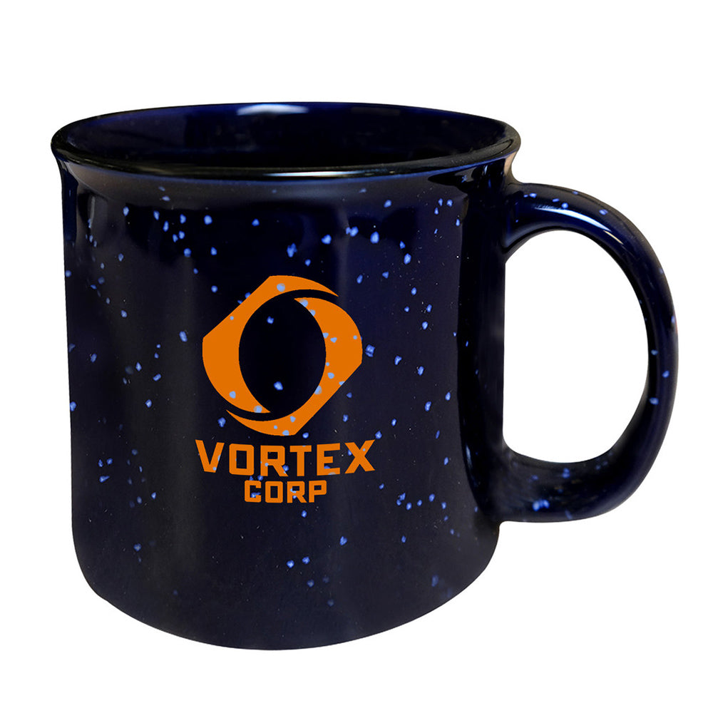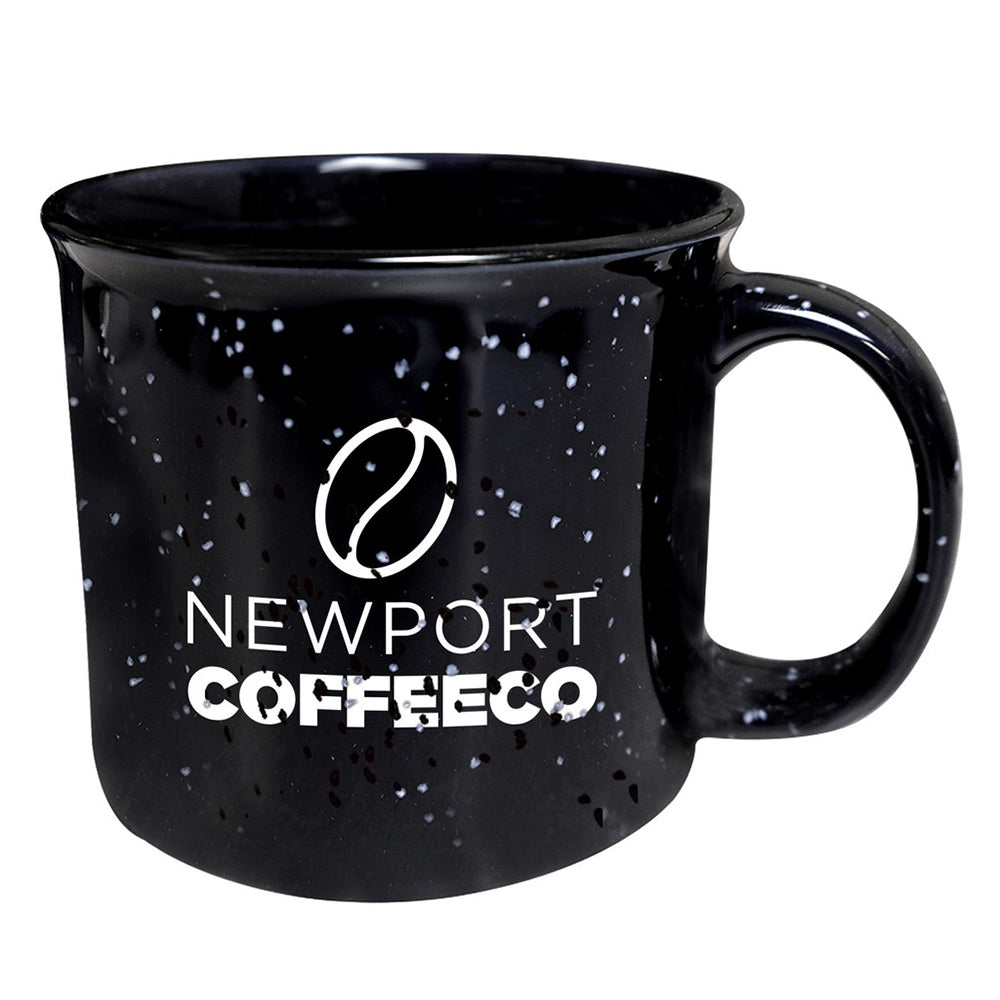 Tasse de camp en céramique de 15 oz avec fini moucheté lustré; rebord noir; large ouverture et grande poignée robuste; couleur intérieure variable selon la couleur extérieure; va au micro‑ondes; lavage à la main recommandé; non recommandé pour un usage commercial.